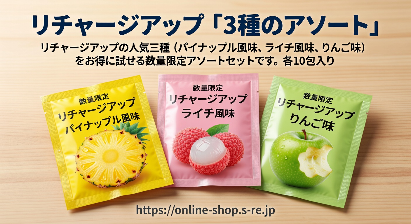 現代の忙しいウェルネスの世界において、利便性・味・実感できる効果を兼ね備えたサプリメントを見つけることは、生活を一変させる可能性があります。そこで注目したいのが、日本の有名フィットネス大手・株式会社ルネサンスが展開する人気クエン酸系サプリメント「リチャージアップ」です。本記事では、人気の3フレーバー——パイナップル、ライチ、アップル——をお得なトライアルセットにまとめた限定数量セット「3種のアソート」をご紹介します。各フレーバー10袋ずつ、計30袋入りで、通常価格12,895円から15%オフの10,961円というお得な価格設定。公式オンラインショップ(https://online-shop.s-re.jp)限定販売のこのセットは、初めてお試しになる方に最適です。フィットネス愛好家の方にも、日常的な疲労回復を求める方にも、アクティブなライフスタイルをサポートします。